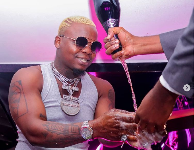 Harmonize umaze iminsi adacana uwaka na Diamond yagaragaje agasuzuguro karenze kuri iriya nzoga ubwo yayikarabiraga mu kabari nk’amazi cyangwa sanitizer ubu zigezweho mu gusukura ibiganza.