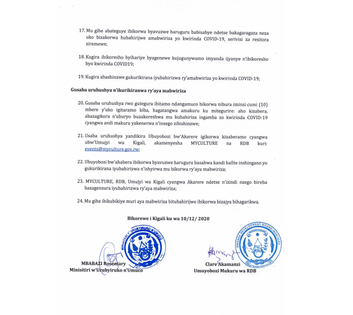 Akomeza ati "Ugura itike yo kwinjira mu bitaramo ndangamuco byavuzwe haruguru ni uwipimishije COVID-19 agahabwa icyemezo cy’uko atanduye.’’