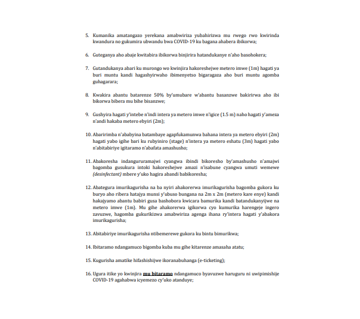 Itangazo rya Minisiteri y’Urubyiruko n’Umuco na RDB rikomeza riti "Ahabera ibi bikorwa kandi hagomba kuba hafite umuryango abantu bashobora kwinjiriramo utandukanye n’uwo basohokeramo, kandi mu gihe abantu binjizwa bigakorwa bahana intera nibura ya metero imwe kandi hagashyirwaho ibimenyetso bigaragaza aho buri muntu agomba guhagarara.’’