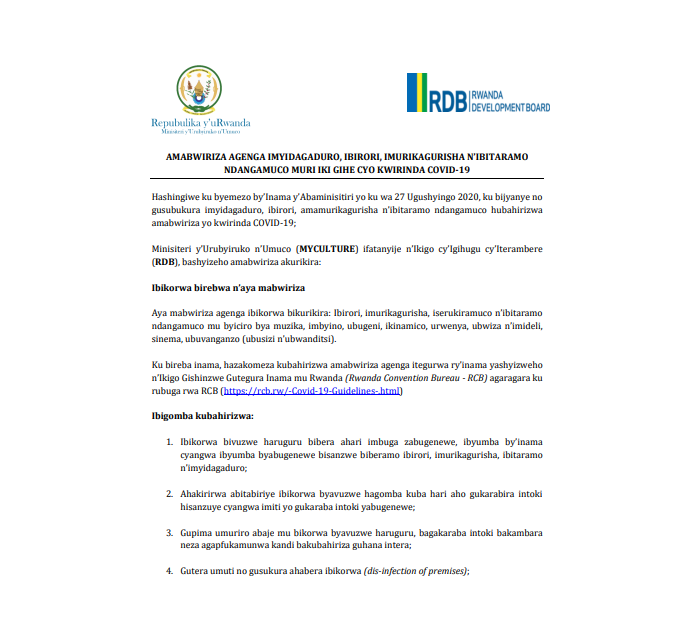 Minisiteri y’Urubyiruko n’Umuco ku bufatanye n’Urwego rw’Igihugu rw’Iterambere yashyize hanze amabwiriza mashya agenga uko ibikorwa by’imyidagaduro, ibirori, imurikagurisha n’ibitaramo ndangamuco bizajya bikorwa muri iki gihe cyo kwirinda COVID-19.