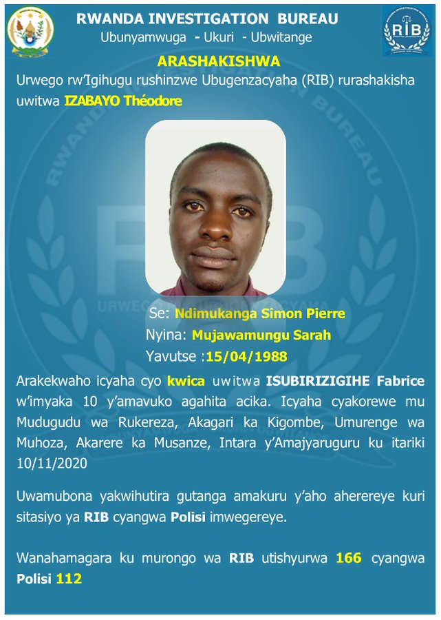 Urwego rw’Igihugu rushinzwe Ubugenzacyaha (RIB), rwatangaje ko ruri gushakisha umugabo witwa Izabayo Théodore, wo mu Karere ka Musanze ukurikiranyweho kwica umwana agahita atoroka.
