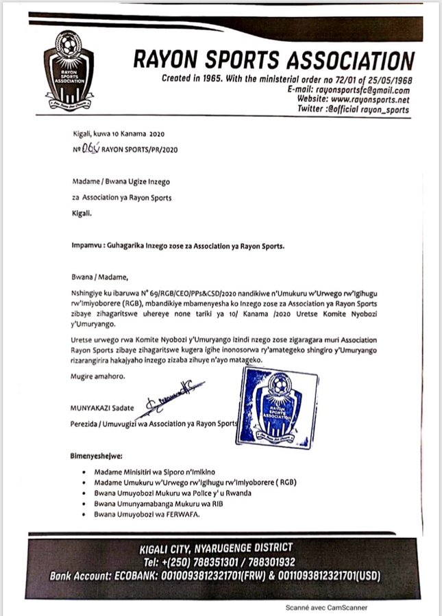 Munyakazi Sadate ati : “Uretse Urwego rwa Komite Nyobozi y’Umuryango, izindi nzego zose zigaragara muri Association Rayon Sports zibaye zihagaritswe kugera igihe inonosorwa ry’amategeko shingiro y’Umuryango rizarangirira hakajyaho inzego zizaba zihuye n’ayo mategeko.”