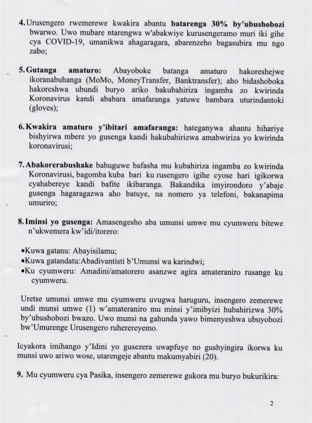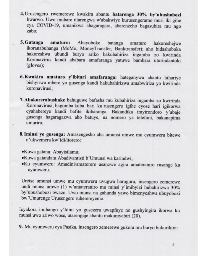 Ingingo ya kane y’aya mabwiriza kandi yibutsa ko urusengero rwemerewe gukora, rutagomba kurenza 30% by’ubushobozi bw’abo rushobora kwakira.