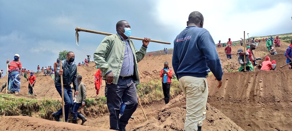 Ubuyobozi bw’Intara y’Amajyepfo, bwatangaje ko uyu munsi Minisitiri Gatabazi yatangiye umunsi we wa kabiri “aha umuganda abaturage 510 bahawe akazi aho bakora amaterasi kuri hegitari 50.”