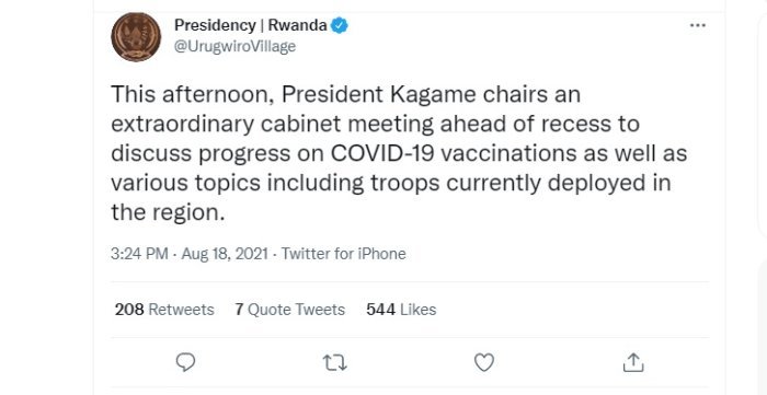 Itangazo by’Ibiro by’Umukuru w’Igihugu, byatangaje ko iyi nama idasanzwe yateranye “kugira ngo barebere hamwe aho gahunda yo gutanga inkingo za COVID-19 igeze, ndetse banaganire ku zindi ngingo zitandukanye zirimo ingabo z’u Rwanda zoherejwe mu butumwa hirya no hino.”
