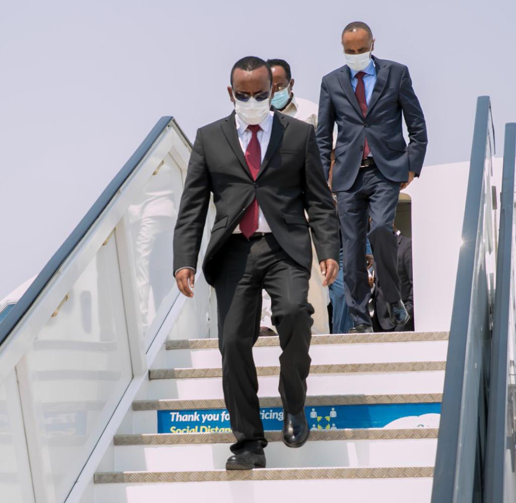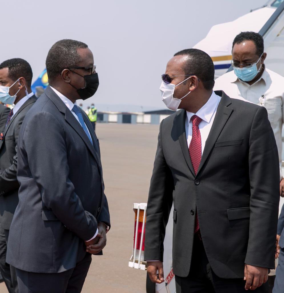 Minisitiri w’Intebe wa Ethiopia, Dr Abiy Ahmed wageze ku Kibuga cy’Indege i Kanombe ku gicamunci cyo kuri iki Cyumweru tariki 29 Kanama 2021, yakiriwe na Minisitiri w’Ububanyi n’Amahanga n’Ubutwererane, Dr Vincent Biruta.