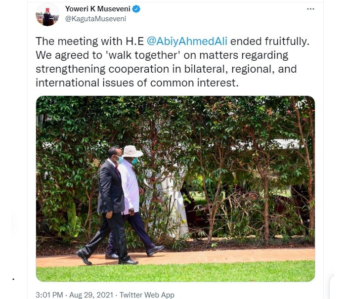 Muri ubu butumwa Perezida Museveni yashyize kuri Twitter, buherekejwe n’amafoto ari kuganira na mugenzi we Dr Abiy bombi ari babiri.
