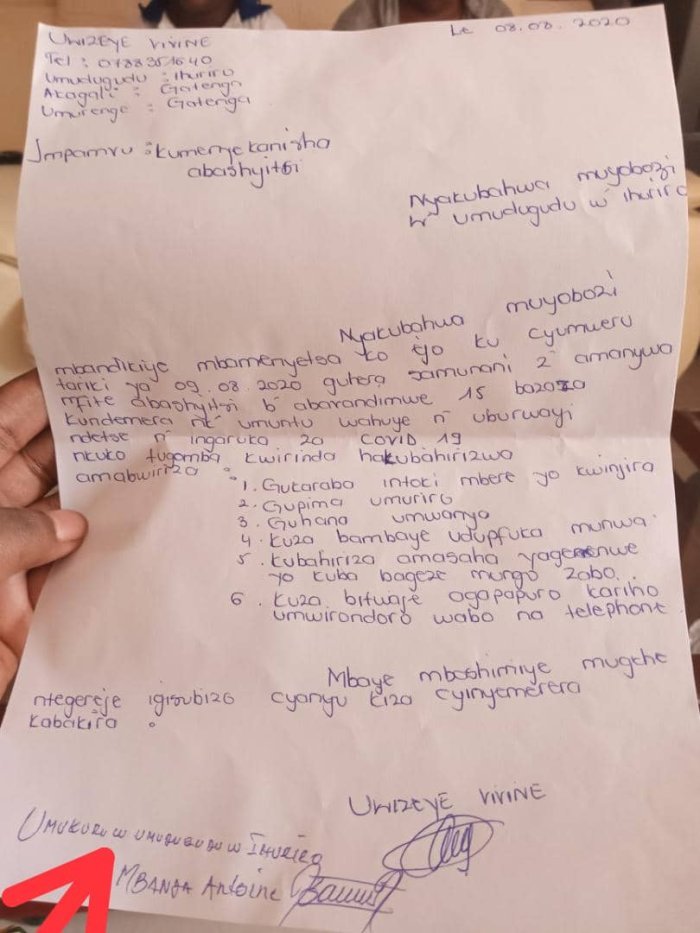 Ibaruwa yari yanditse asaba uburenganzira bwo kwakira abaje kumuremera