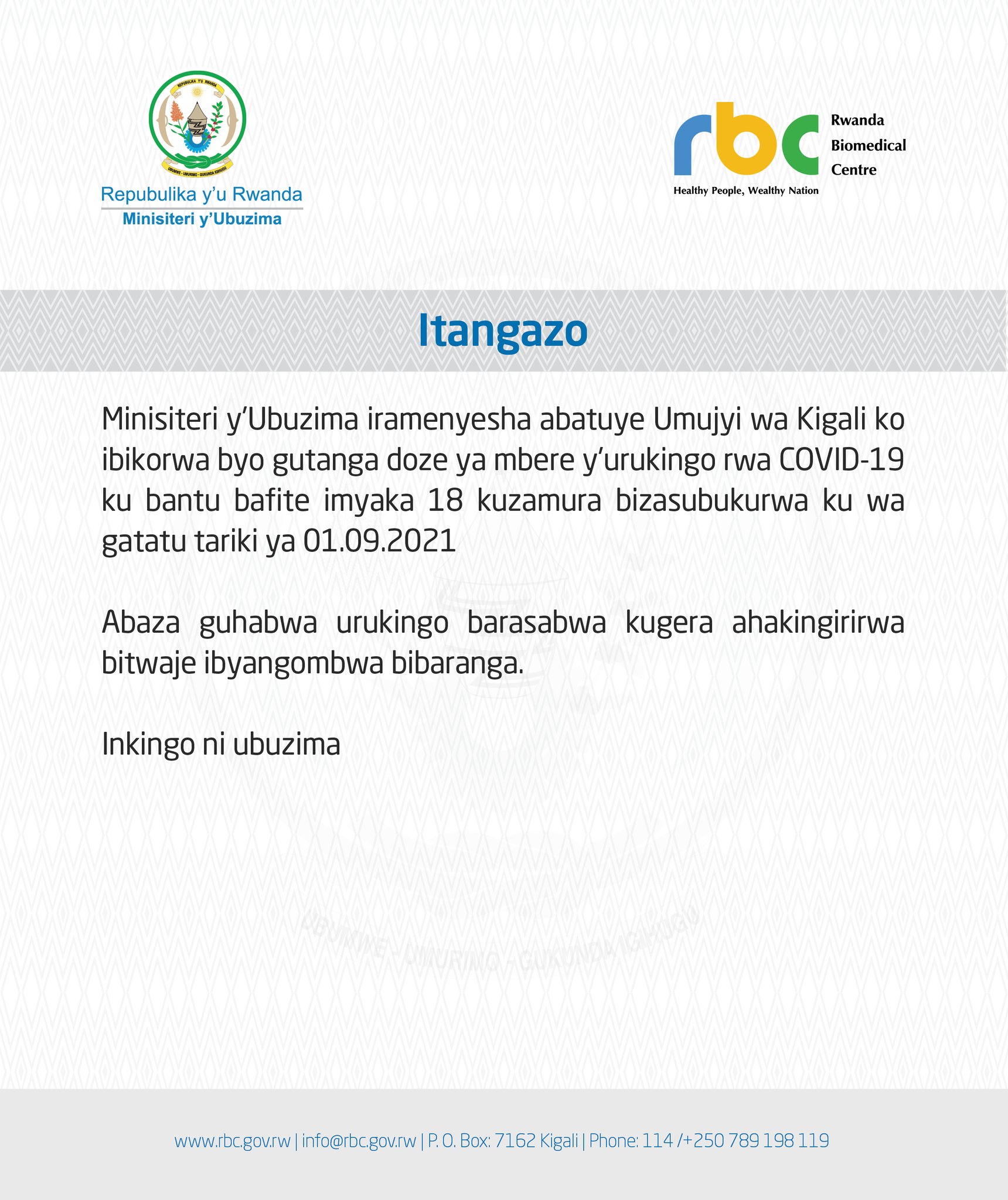 Itangazo rya ririya subika ryo gukingira abafite guhera ku myaka 18 mu Mujyi wa Kigali, ryavugaga guhera ku wa Gatandatu tariki ya 28 Kanama 2021, mu Mujyi wa Kigali hazakomeza gukingirwa gusa abafata doze ya 2 y’urukingo rwa Covid-19.