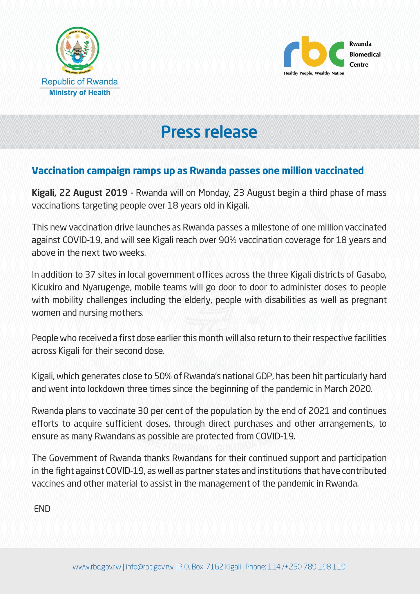 Kuri uyu wa Mbere tariki 23 Kanama 2021, mu Rwanda hatangiye icyiciro cya gatatu cyo gutanga urukingo rwa COVID-19 aho cyatangiriye mu Mujyi wa Kigali kigenewe abafite guhera ku myaka 18.