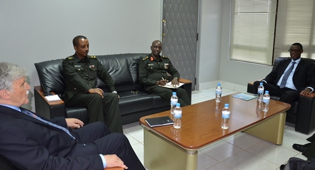 Lt Gen (Rtd) Romeo Dallaire yakiriwe na Minisitiri w’ingabo, Gen James Kabarebe ari kumwe n’Umugaba mukuru w’Ingabo, Gen Patrick Nyamvumba baganira ku bibazo bikigarara ku Isi aho abana bakoreshwa mu gisirikare.