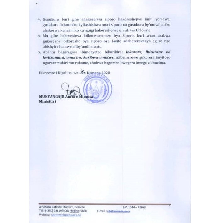 Kuri uyu Gatanu, Minisiteri ya Siporo yatangaje ko ibikorwa byari byakomorewe aribyo birakomeza gukomorerwa ariko hakubahirizwa amabwiriza yo kwirinda icyorezo cya COVID19.