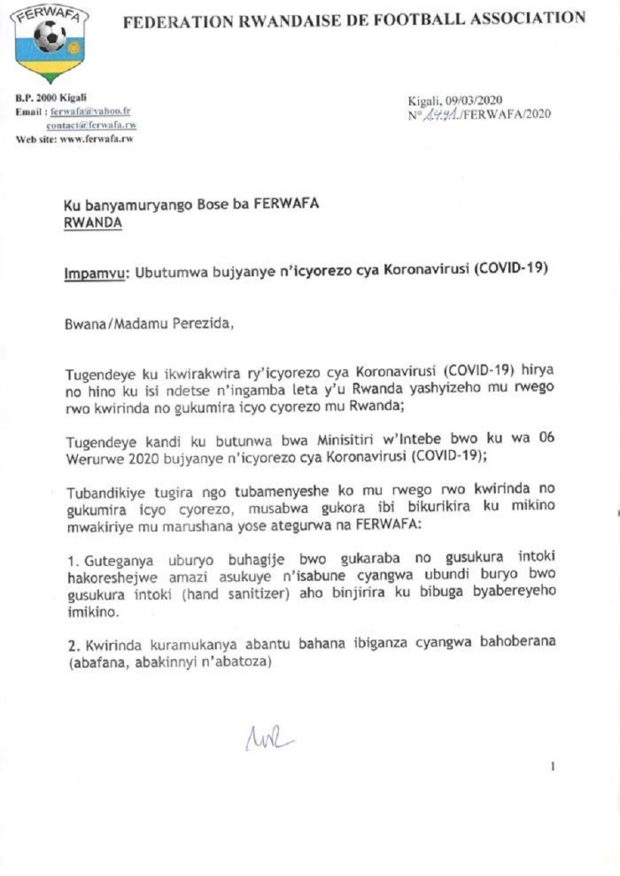 Tubandikiye tugira ngo tubamenyeshe ko mu rwego rwo kwirinda no gukumira icyo cyorezo musabwa gukora ibi bikurikira mu mikino mwakiriye yose ku marushanwa ategurwa na FERWAFA :
