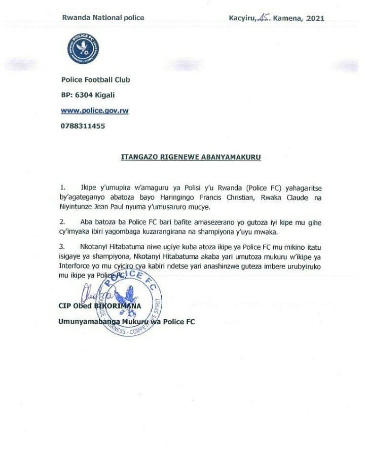 Itangazo rya Polisi FC, rivuga ko iyi kipe yirukanye by’agataganyo Haringingo Francis Christian ndetse n’abamufashaga barimo Rwaka Claude wari umwurungirije na Niyitunga Jean Paul wari umutoza wo kongerera ingufu abakinnyi.